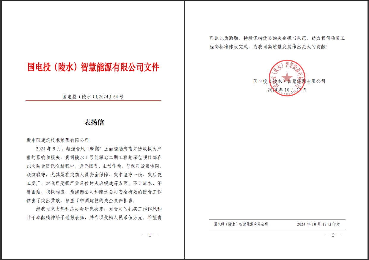 10月17日,中國(guó)建技收到國(guó)電投(陵水)智慧能源有限公司表揚(yáng)信。對(duì)中國(guó)建技海南陵水1號(hào)能源站二期工程項(xiàng)目部在今年9月超強(qiáng)臺(tái)風(fēng)“摩羯”登陸海南期間,為防臺(tái)工作作出的突出貢獻(xiàn)給予通報(bào)表揚(yáng)。