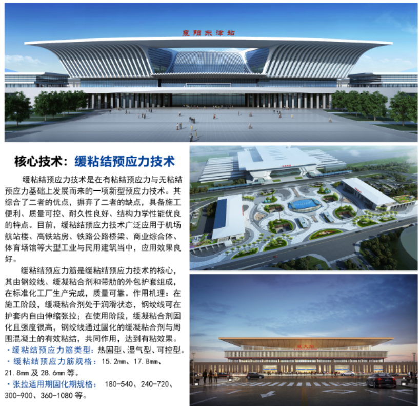 在我國鐵路、航空、公路等交通行業(yè)事業(yè)蓬勃發(fā)展的進(jìn)程中,中技集團作出了積極貢獻(xiàn),一是積極參與40余座高鐵客站建設(shè),如北京豐臺南站、北京朝陽站、北京副中心站、北京大興站,“一帶一路”中緬鐵路緬甸萬象站,川藏鐵路澤當(dāng)站、林芝站,中國第四代鐵路客站杭州西站、廣州白云站等,樹立了“中技預(yù)應(yīng)力”優(yōu)質(zhì)品牌。二是高度重視預(yù)應(yīng)力技術(shù)標(biāo)準(zhǔn)的升級,先后編制發(fā)布或在編多部預(yù)應(yīng)力相關(guān)標(biāo)準(zhǔn),如《大直徑緩粘結(jié)預(yù)應(yīng)力鋼絞線》、《濕氣型緩粘結(jié)預(yù)應(yīng)力鋼絞線》、《濕氣型緩粘結(jié)預(yù)應(yīng)力鋼絞線專用粘合劑》、《公路橋梁緩粘結(jié)預(yù)應(yīng)力混凝土結(jié)構(gòu)技術(shù)指南》、《緩粘結(jié)預(yù)應(yīng)力錨桿錨樁技術(shù)規(guī)程》、《超高強預(yù)應(yīng)力鋼絞線》等。三是高效推進(jìn)預(yù)應(yīng)力科研成果轉(zhuǎn)化,創(chuàng)造了多個“國內(nèi)首個”,先后實施了國內(nèi)首個大直徑緩粘結(jié)預(yù)應(yīng)力技術(shù)應(yīng)用項目(高鐵安順西站站前廣場,2016年),國內(nèi)首個濕氣型緩粘結(jié)預(yù)應(yīng)力技術(shù)應(yīng)用項目(阜陽西站站前廣場,2018年),國內(nèi)首個緩粘結(jié)預(yù)應(yīng)力錨桿技術(shù)應(yīng)用項目(南海體育中心,2020年),國內(nèi)首個緩粘結(jié)預(yù)應(yīng)力抗浮樁技術(shù)應(yīng)用項目(化龍安置區(qū)工程,2020年),國內(nèi)首個超高強預(yù)應(yīng)力技術(shù)應(yīng)用項目(廈門新體育中心,2021年)。