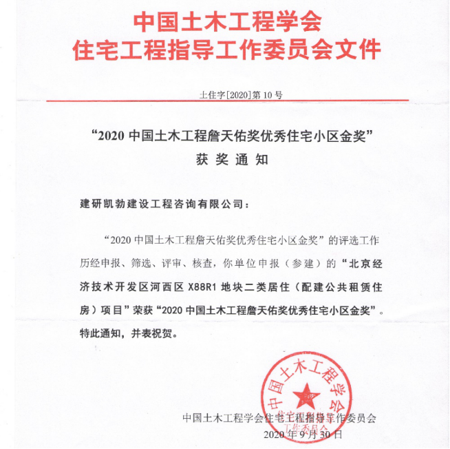 近日,建研凱勃建設(shè)工程咨詢有限公司(以下簡(jiǎn)稱“建研凱勃”)監(jiān)理的北京經(jīng)濟(jì)技術(shù)開發(fā)區(qū)河西區(qū)X88R1地塊二類居?。ㄅ浣ü沧赓U住房)項(xiàng)目榮獲2020中國(guó)土木工程詹天佑獎(jiǎng)優(yōu)秀住宅小區(qū)金獎(jiǎng),這是繼該項(xiàng)目獲得北京市結(jié)構(gòu)長(zhǎng)城杯金質(zhì)獎(jiǎng)后的又一重大獎(jiǎng)項(xiàng)。