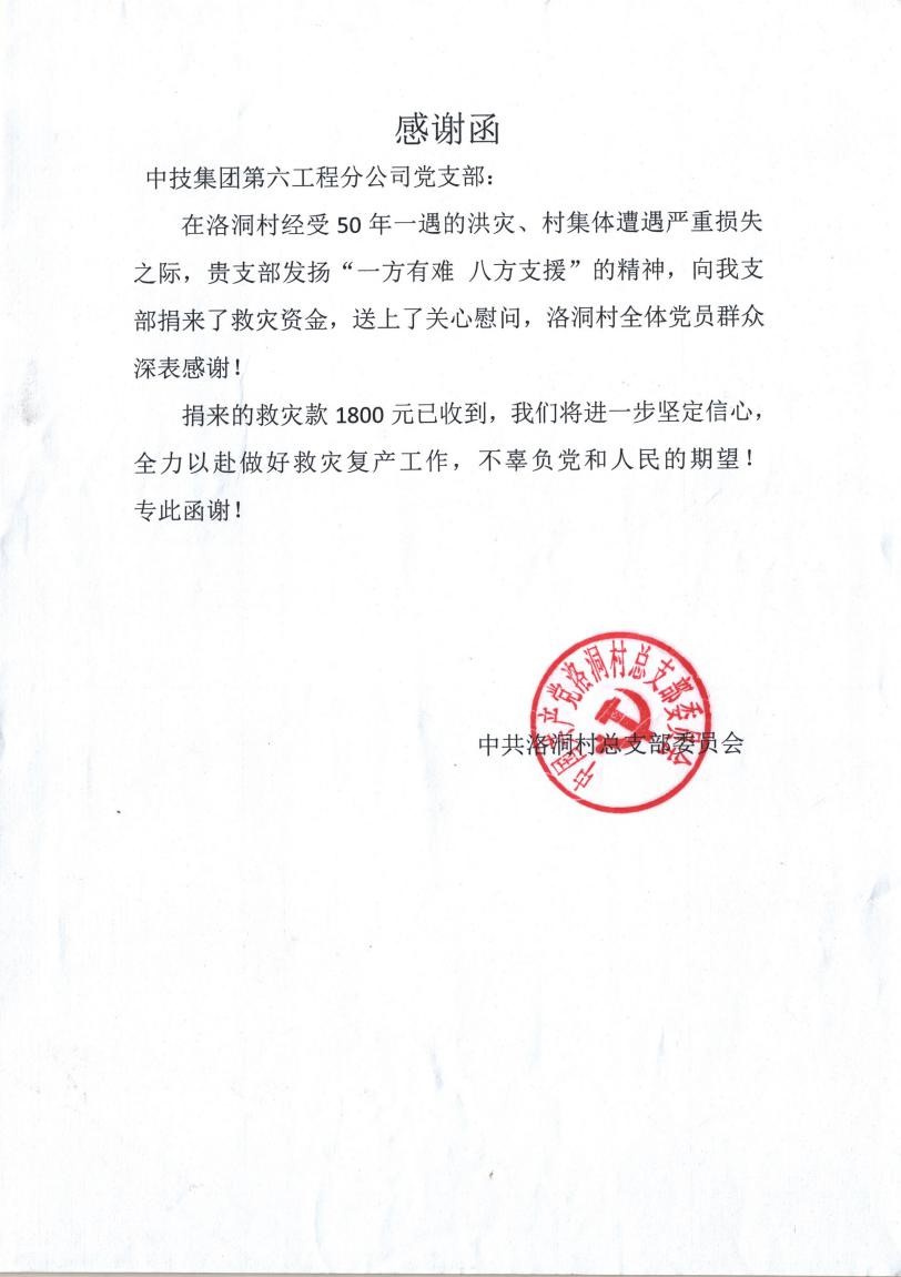 6月17日、6月23日第六工程分公司清遠恒大御泉四季花園總承包項目部及第六工程分公司黨支部接連收到了清遠市中共佛岡縣委、佛岡縣人民政府、中共洛洞村總支部委員會的感謝信,感謝信內(nèi)容主要是針對中技集團清遠恒大御泉四季花園總承包項目部及第六工程分公司黨支部在6月7日至6月9日清遠市佛岡縣發(fā)生的50年一遇的洪災中做出的巨大貢獻表示真誠的感謝。?