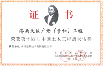 設(shè)計三所設(shè)計的濟(jì)南天地廣場(貴和)項目榮獲“第十四屆中國土木工程詹天佑獎”。中國土木工程詹天佑獎(簡稱詹天佑獎)是經(jīng)科技部核準(zhǔn),建設(shè)部認(rèn)定,在建設(shè)部、鐵道部、交通部、水利部的共同支持與指導(dǎo)下,以弘揚科技創(chuàng)新精神,表彰獎勵在科技創(chuàng)新與新技術(shù)應(yīng)用中成績顯著的工程項目為宗旨的獎項,是我國土木工程建設(shè)領(lǐng)域的最高榮譽獎。項目負(fù)責(zé)人石巍代表設(shè)計三所于2017年4月14日參加了頒獎大會。