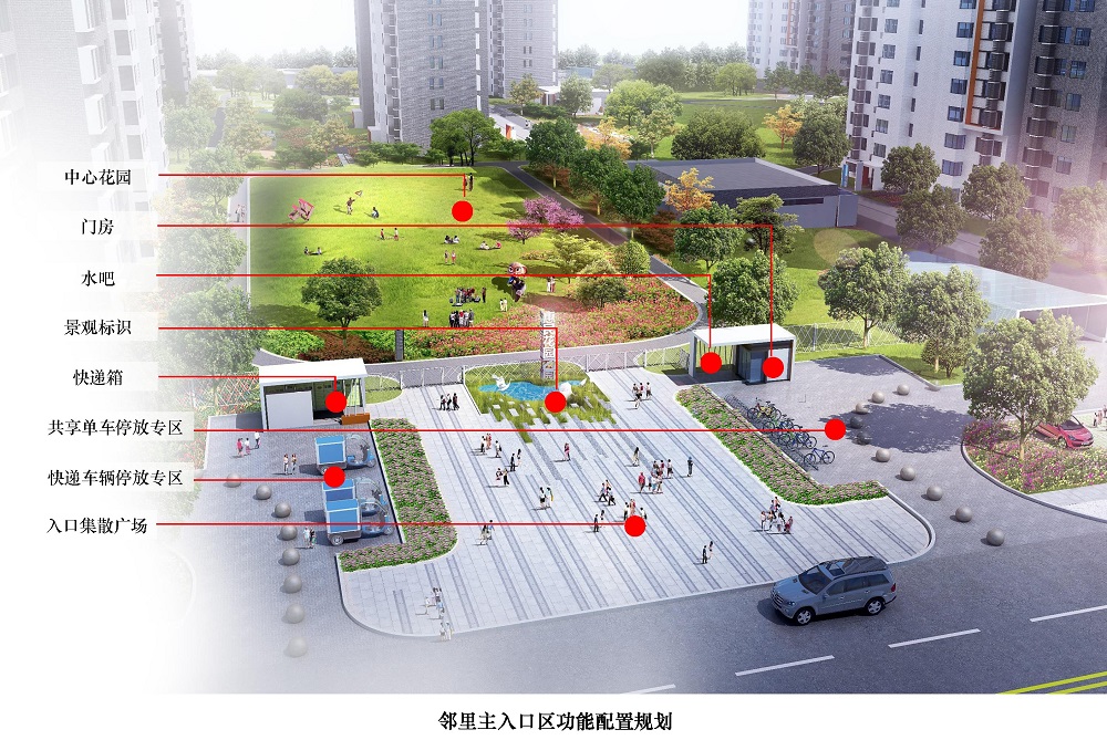 主入口實(shí)行人車分流組織,設(shè)置集散廣場(chǎng)、景觀標(biāo)識(shí)和中心花園。精細(xì)化布局門(mén)房、快遞箱、水吧、共享單車與快遞車輛停放專區(qū),形成功能強(qiáng)大的新型住區(qū)入口服務(wù)系統(tǒng)。
