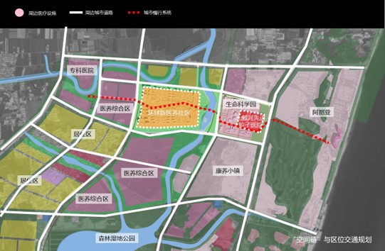 環(huán)球新醫(yī)養(yǎng)社區(qū)地處示范區(qū)核心區(qū)的中心地帶,東部緊鄰啟動區(qū)——生命科學園,北部為醫(yī)務人員專屬居住區(qū),西部和南部為其他規(guī)劃中的醫(yī)療、醫(yī)養(yǎng)、康養(yǎng)綜合用地,本規(guī)劃區(qū)周邊水綠環(huán)繞,具有得天獨厚的自然環(huán)境條件和產(chǎn)業(yè)功能區(qū)位優(yōu)勢。