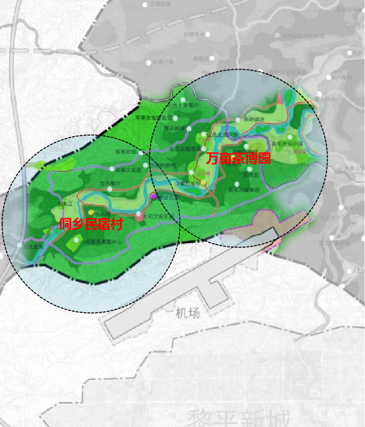 項目地處湘、黔、桂三?。▍^(qū))交界的侗鄉(xiāng)腹地,黎平侗鄉(xiāng)風景名勝區(qū)北部,以八舟河、天生橋景區(qū)為核心,基地南北長11600米,東西長14400米,總面積約53平方公里。