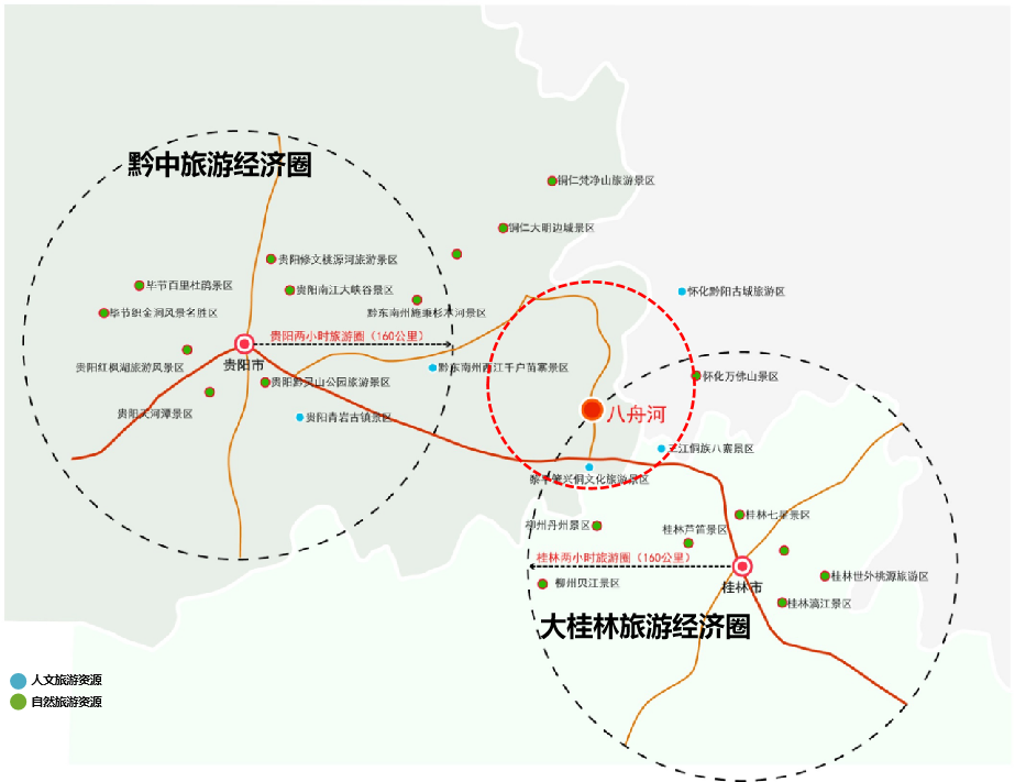 八舟河景區(qū)山水資源豐富、溪流密布,集巖溶地貌、田園溪流、河湖森林等自然景觀為一體,同時也是白茶重要產(chǎn)地之一、生長著多種異花異草、名貴中草藥材,具有很高的觀賞價值、科學價值、游憩價值。同時,項目地處黔中旅游圈層及大桂林旅游圈層兩小時旅游圈外圍,通過打造旅游度假綜合體恰好彌補了“貴州—桂林”兩小時旅游圈市場的空白。