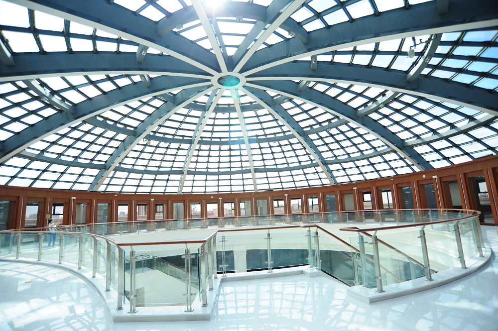 主體建筑長55.8米,寬61.2米,高54米,體量集中緊湊。外立面造型簡約、典雅,以中軸線東西對稱布局的形式表現(xiàn)了建筑的端莊、神圣。外裝飾石材實體墻、柱廊、玻璃幕的虛實對比光影的變化,表現(xiàn)了建筑的藝術(shù)美和恢弘氣勢。四個立面設(shè)計的柱廊每面6根共24根柱式,代表了一年四季24節(jié)氣,春夏秋冬,四季常青,蘊含著自然和生命的和諧,裝飾柱被譽為“生命和平柱”。