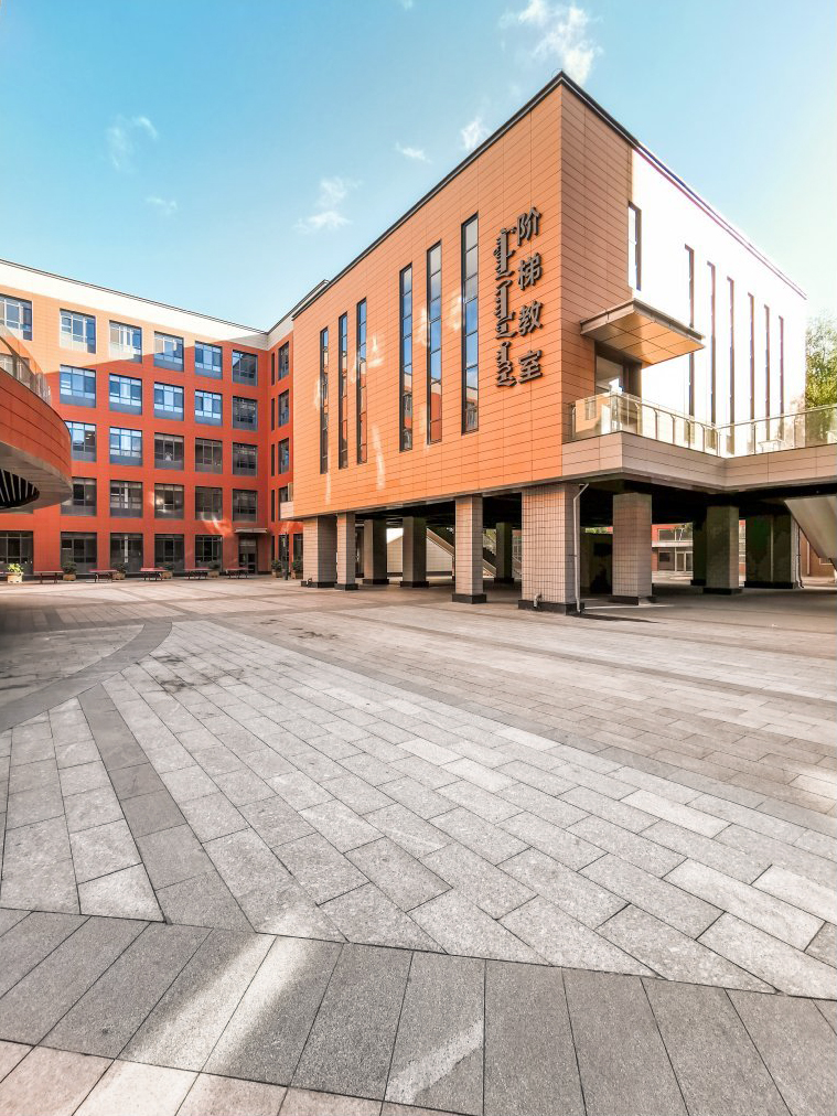 內(nèi)蒙古師大附中是一所蒙漢合校的民族中學(xué),是具有地區(qū)特色、時代特征和民族特色的自治區(qū)窗口學(xué)校。故本項目從蒙古包的民族特色中提取靈感,結(jié)合辟雍的空間原型,形成蒙漢文化交融的校園特征。庭院圍合的外部空間與圓形輻射型空間相互滲透,演繹變異的蒙古包形式虛實結(jié)合,現(xiàn)代典雅。