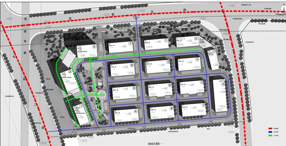 根據(jù)對(duì)場(chǎng)地周邊環(huán)境及場(chǎng)地本身的特點(diǎn),結(jié)合高新區(qū)規(guī)劃局的規(guī)劃設(shè)計(jì)要求,本方案分別在光谷二路及高新五路布置主要出入口,結(jié)合中心花園設(shè)計(jì),通過南北、東西方向兩條主要視覺景觀軸線塑造園區(qū)良好的景觀形象。從而打造高檔建筑標(biāo)準(zhǔn),優(yōu)異的環(huán)境品質(zhì)新型高端研發(fā)生產(chǎn)園區(qū)。建筑空間布局北高南低,在高新五路與光谷二路交叉口處設(shè)置兩棟標(biāo)志性25層孵化器研發(fā)大樓。沿高新五路設(shè)置9層研發(fā)車間,基地內(nèi)部建筑層數(shù)高低錯(cuò)落,整個(gè)建筑群天際線變化豐富。